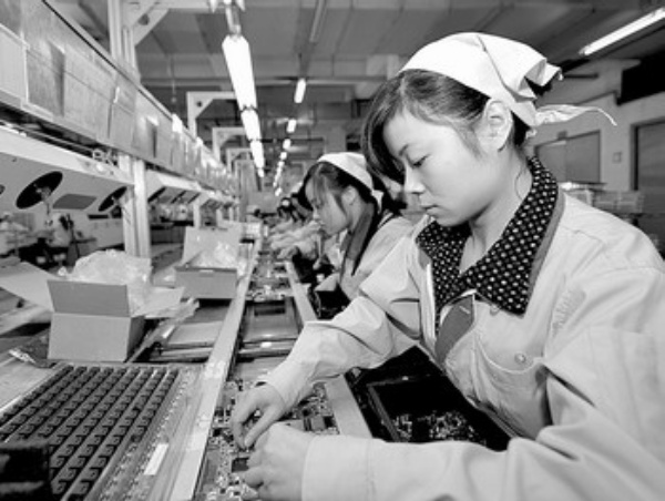 东莞技嘉电子有限公司的女工在给电脑主板插线。 新华社记者 陈晔华摄