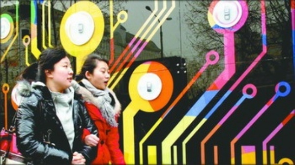 2009年12月30日,北京西单商业街,嵌挂3G手机的广告墙板非常醒目。