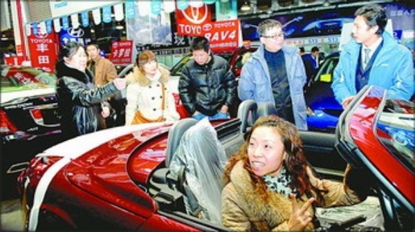2009年12月28日,北京亚运村汽车交易市场,消费者在选购家用轿车。