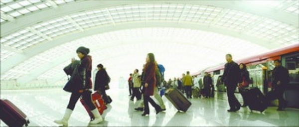 2009年12月29日,乘客乘坐北京机场快轨准备进入首都机场T3航站搂。新年将至,机场客流显著增多。
