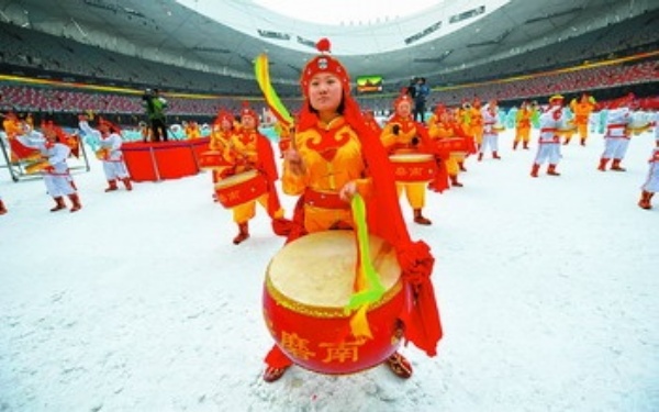 1月1日,参加启动仪式的表演队在表演。当日,“2010年北京市朝阳区全民健身启动仪式”在“鸟巢”举行。2010人在“鸟巢”内表演了太极拳、功夫扇等民族传统健身项目。