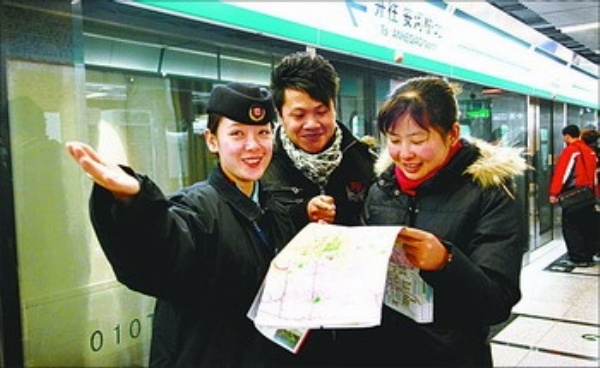 图1:2010年1月1日清晨5时许,北京地铁4号线角门西站,工作人员付莹(左一)为搭乘首班地铁的旅客作出站指引。