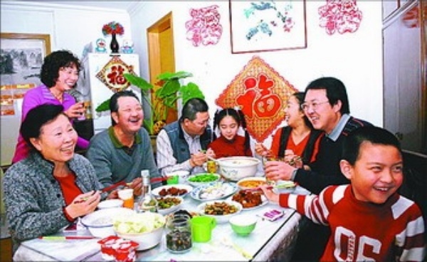 图2:2010年1月1日中午,家住宣武区天桥北里3楼的李尚秀(前左二)夫妇与儿子、儿媳、孙子、孙女一起吃新年第一顿团圆饭。