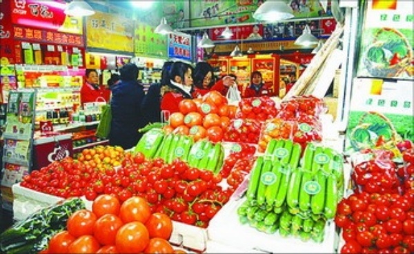 图4:2010年1月1日清晨,北京崇文门菜市场,首批顾客看到的是新鲜上市的无公害瓜果蔬菜。