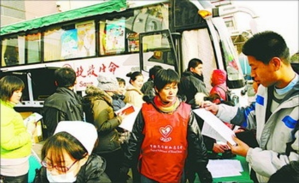 图5:2010年1月1日上午,北京西单图书大厦前,许多市民在无偿献血车前排起长队,在元旦这天献上自己的爱心。
