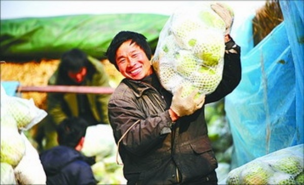 图6:2010年1月1日中午,北京新发地蔬菜批发市场,来自山东的刘桂红正在搬卸刚抵京的蔬菜,这是新年进京的第一批外地鲜蔬。