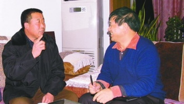 种粮大户张军清(左)向本报记者喜算2009年增收账。       赵国锋摄