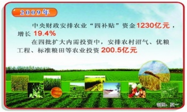 目前中央财政已安排农业“四补贴”资金1230亿元,增长19.4%;安排农村沼气、优粮工程、标准粮田等农业投资200.5亿元。增加农业补贴进一步调动了地方和农民积极性,加大公共事业投入进一步改善了农村民生,实施促进消费措施进一步开拓了农村市场,农业农村政策效应得到充分发挥。