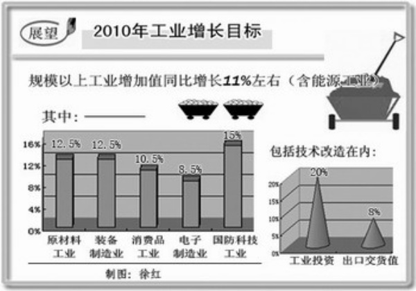 2010年,根据中央确定的经济增长8%左右的预期目标,我们将工业增速指标定为11%左右,既保持一个适度的增速,又不追求过高的目标。就是希望在保持工业平稳较快发展的同时,引导地方、行业和企业把工作重点放到转变发展方式、调整结构、提高工业增长的质量和效益上。