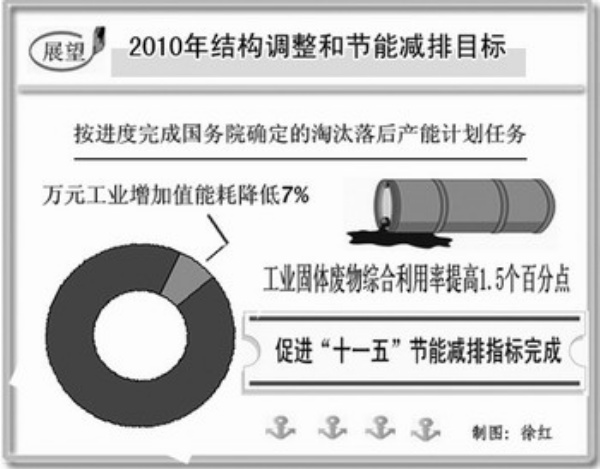 2010年,工业和信息化部将以重点产业调整振兴规划确定的目标任务为重点,逐项落实实施细则,力争在控制总量、淘汰落后、兼并重组、节能减排等方面取得显著进展。