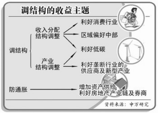 国泰君安认为,目前A股上市公司中,投资品行业和货币敏感型行业的上市公司市值占比和利润占比都极高。2009—2010年的上市公司业绩也充满了货币投放带来的业绩效应,随着宏观经济调结构力度加大,股市也面临着调结构,消费品行业市值与利润可望占比上升。
