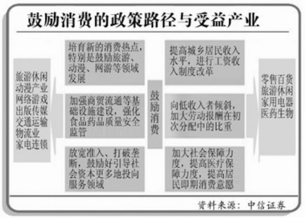 券商研究机构认为,在各项政策促进下,我国消费2010年有望继续增加,消费对经济增长的贡献率也会加大。同时,加大居民收入调整分配力度,确定了一手促消费、一手抓保障的政策基调,从而保证消费的健康和可持续增长。