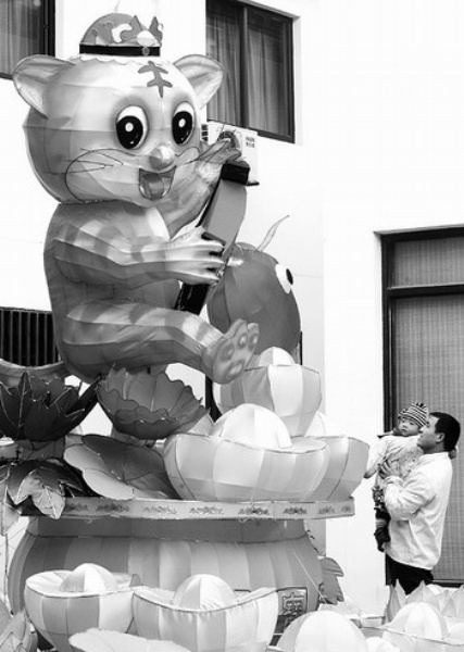 一位家长抱着孩子在江苏苏州街头观赏一组吉庆的“生肖虎”彩灯。连日来,古城苏州张灯结彩,弥漫着浓浓的节日气氛。 杭兴微摄 (新华社发)