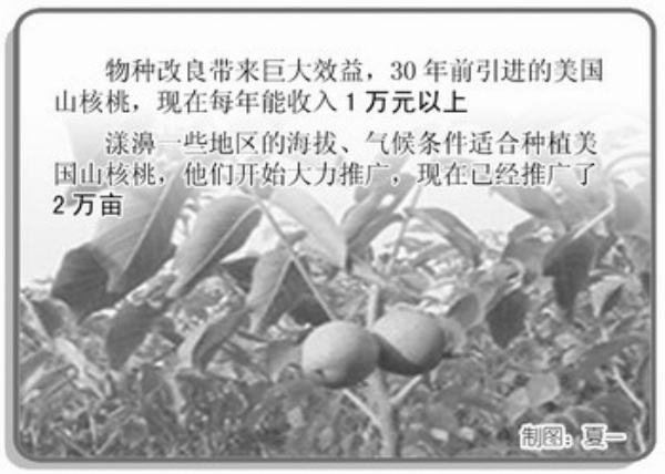 不过,县里对老常的支持也很大。“山顶的蓄水池是水利局支持建的,林业局有苗木补助资金,2009年还修通了3.5公里上山的路。”说起核桃种植,常永祥滔滔不绝,“县里帮我们总结了‘六个一’,就是找一块好地,挖一个大坑,挑一棵好苗,施一担有机肥,浇一担水,铺一片保墒薄膜。掌握了这‘六个一’,种好核桃就八九不离十了。”