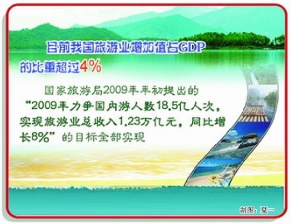 本报讯 2009年,我国旅游业强劲复苏,逆势上扬,成为撬动国内消费的有力杠杆之一。国家旅游局2009年初提出的“力争国内游人数18.5亿人次,实现旅游业总收入1.23万亿元”的目标全部实现。回眸2009年,中国旅游业亮点纷呈,正向国民经济战略性支柱产业目标迈进: