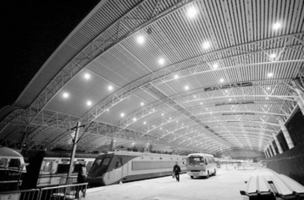 1月5日拍摄的正在安装大型无柱雨棚的铁路上海站新站台。 2010年上海世博会“陆上迎宾大门”———铁路上海站改造工程目前已进入尾声,上海站新站台即将亮相,预计今年春运前投入使用。 新华社发