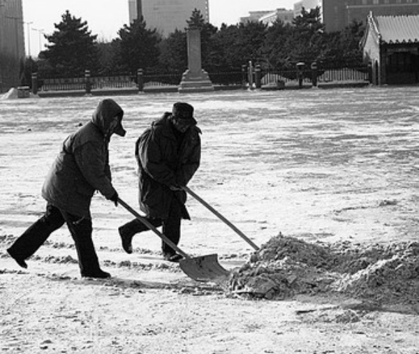 沈阳市除雪部门工作人员正在清除北陵公园门前的积雪。 本报记者 苏大鹏摄