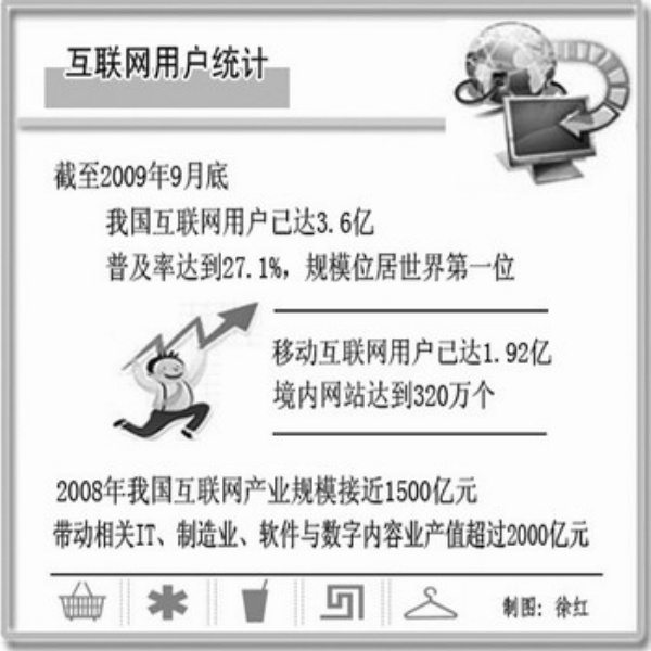 我国互联网发展迅速。据统计,截至2009年9月底,我国互联网用户已达3.6亿,普及率达到27.1%,规模位居世界第一位;2008年我国互联网产业规模接近1500亿元,带动相关IT、制造业、软件与数字内容业产值超过2000亿元。