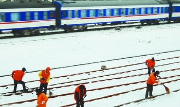 1月6日,南昌铁路局职工在京九铁路江西九江段线路上清扫冰雪。 1月5日下午,江西省九江市降下新年首场雪,南昌铁路局连夜组织人员对大桥、线路进行不定时清扫,确保京九铁路安全畅通。 胡国林摄(新华社发)