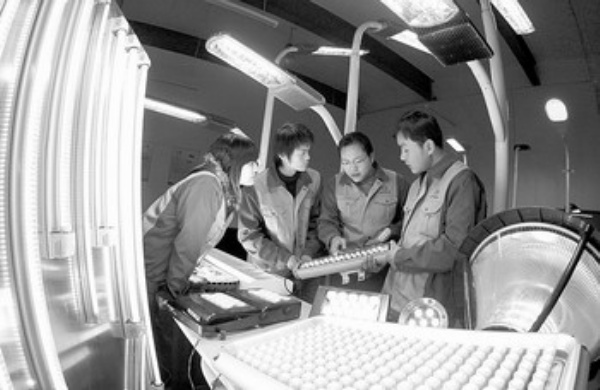 ▲2009年12月28日,天津工业大学海宇半导体照明产业化基地的技术人员在测试LED照明灯。由天津工业大学半导体照明工程研发中心自主研制的LED照明灯具,比普通灯具节电60%以上。 新华社记者 刘海峰摄