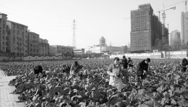 2009年12月6日上午,在武汉市洪山区一片被摩天大楼包围的菜地里,记者见到了享誉全国的原产地出产的洪山菜薹。放眼望去,深紫色的菜叶随风摇曳,煞是好看。