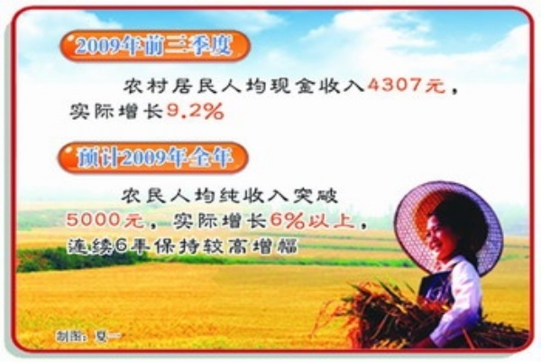 农业部有关负责人在接受记者采访时说,2009年农民收入增长形势好于年初预期。据国家统计局提供的数据,2009年前三季度,农村居民人均现金收入4307元,实际增长9.2%。