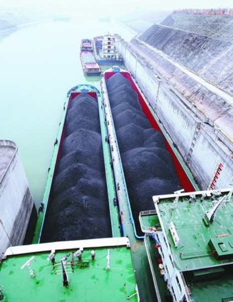 1月8日,运煤船舶通过三峡船闸六闸首下行。 为确保电煤运输,长江三峡通航管理局为电煤运输开辟绿色通道,自今年1月1日起,三峡船闸日均通过电煤近10万吨。 郑家裕摄 (新华社发)