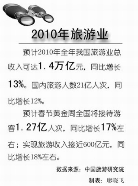 2010年,我国的旅游业将进入发展的黄金机遇期,也将进入一个变革创新的关键阶段。初步估算,2010年,国内游将突破21亿人次,收入过11000亿元,增幅达到10%;与此同时,出境游的增幅将达到两位数,入境游的增幅也将回升至8%。