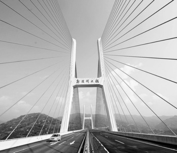 蓝天白云下的渝宜高速公路彭溪河大桥。 2009年,重庆市高速公路竣工通车412公里。截至目前,重庆高速公路通车里程已达1577公里。 新华社记者 周衡义摄