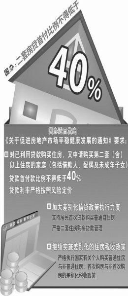 《通知》指出,加大差别化信贷政策执行力度。金融机构要严格二套住房购房贷款管理,抑制投资投机性购房需求。并再度重申,“对已利用贷款购买住房、又申请购买第二套(含)以上住房的家庭,贷款首付款比例不得低于40%,贷款利率严格按照风险定价。” 尽管“二套房首付不低于40%”的政策自2007年底以来已经在实施,此次《通知》再度重申,表明国家将进一步加大差别化信贷政策执行力度,进一步抑制投资投机性购房需求。