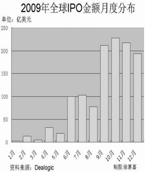 该报告称,2009年共有187家中国公司通过IPO募集资金大约505亿美元,紧随其后的是美国(69个IPO募集资金205亿美元)和巴西(6个IPO募集资金130亿美元)。2008年,美国是IPO最活跃的国家(融资额为308亿美元),其次是中国(融资额为182亿美元)和巴西(168亿美元)。以融资额计算,2009年有四家中国大陆公司跻身全球IPO十强,分别是中国建筑、中国中冶、龙源电力以及中国船舶重工。