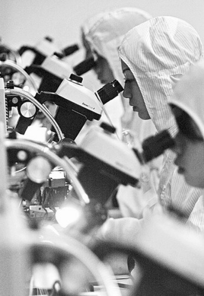 东湖高新区致力于成为综合性高新技术产业基地和全球光电子信息产业基地之一。图为某光电器件企业生产线一角。
