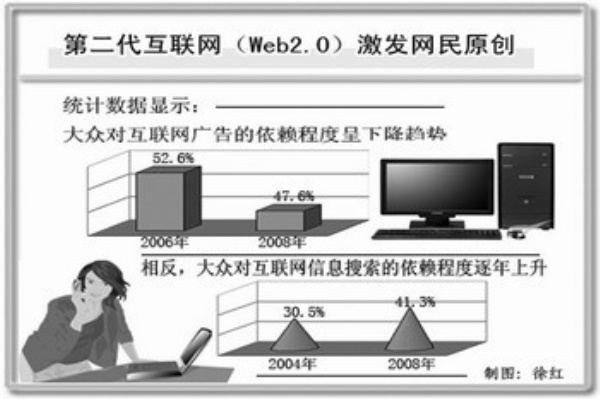 每个人都参与其中,这正是Web2.0最突出的特色。而消费者对这些出自普通网民之手,不带有任何商业目的原创内容的信任度,也远高于各种形式的广告。来自市场监测机构中国市场与媒体研究的数据显示,大众对广告的依赖程度呈现下降趋势,从2006年的52.6%下降到2008年的47.6%;相反,大众对互联网信息搜索的依赖程度则逐年上升,从2004年的30.5%上升到2008年的41.3%,上升趋势十分明显。在海外,这一趋势也同样不可忽视,在日本,有17%的网民根据网络口碑决定购买行为。