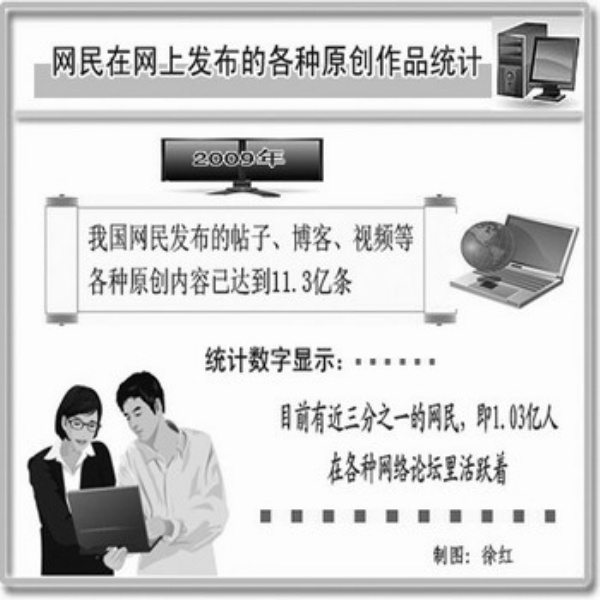 上网游戏,在视频网站上看搞笑视频,泡论坛,写博客……在过去的一年中,这已经是不少网民的日常生活。如果说几年前的互联网像一张内容无限的电子报纸,那么现在的互联网则更像是一个大的信息交流平台,用户不仅是信息的接收者,更是信息的生产者和传播者。统计数据显示,2009年我国网民发布的帖子、博客、视频等各种原创内容已达到11.3亿条,比2008年增长了3.14倍,每个网民平均贡献了3条原创内容。