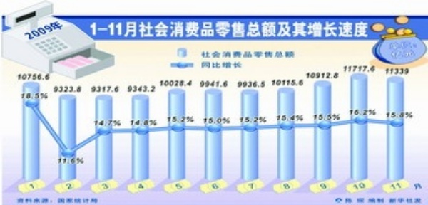 国家统计局公布,2009年前11个月,我国社会消费品零售总额11.3万亿元,同比增长15.3%,剔除价格因素实际增速达到16.9%。以此为基础,商务部预测,2009年全年社会消费品零售总额将超过12.5万亿元,增长达15%以上。