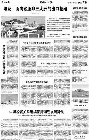 埃及投资部长最近访华时表示,埃及苏伊士西北湾经济区可以成为中埃两国投资合作的增长引擎。该经济区毗邻苏伊士运河和因苏哈那港,距苏伊士城44公里,距埃及首都开罗130公里,由埃及泰达投资有限公司负责开发建设和运营管理。该经济区起步区为1平方公里,扩展区为6平方公里,目前已经完成起步区基础设施建设,道路、港口、供水、供电、天然气、通信、铁路等配套一应俱全。埃及政府投资20多亿埃镑,在经济区的东部海滨兴建了因苏哈那港。因苏哈那港濒临红海,是埃及的第三大港口,年吞吐量为100万吨,可容纳20英尺的集装箱10万个。经济区内企业可享受埃及政府对外签订的各种自由贸易协定的优惠政策,绝大部分产品在当地增值超过40%即可获得原产地证书,产品出口美国、欧盟、东南部非洲和阿拉伯国家,其进口原料可享受全部免除进口关税待遇,而且不受配额和其他附加条件限制。埃及的有关行业基金会还对区内的纺织、家具、皮革制品、建筑材料等,按当地增值程度依据出口报关额给予4%—12%的资金奖励。目前已有多家中国企业进驻园区,投资金额约2亿美元。埃方估计,该经济区在未来几年将吸引汽车、纺织、家电、家具和石油石化产品等行业150家左右的中国公司前来落户,吸纳15亿—20亿美元的投资。
