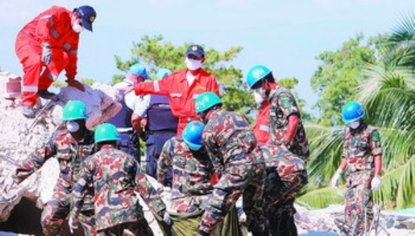 1月15日,在海地首都太子港,中国国际救援队在联合国驻海地稳定特派团大楼废墟中开展救援行动。