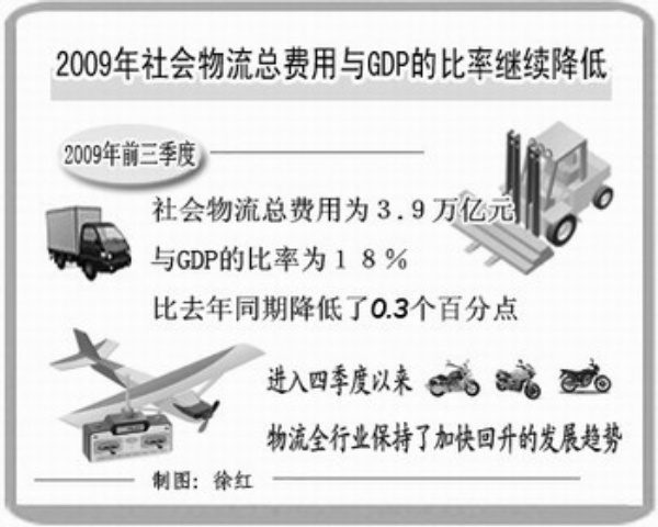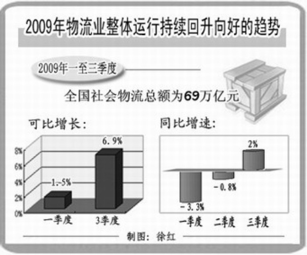 物流需求在投资和经济增长带动下企稳回升步伐有所加快。据中国物流与采购联合会副会长兼秘书长崔忠付介绍,2009年前三季度社会物流总额为69万亿元,同比增速从上半年下降0.8%转为增长2%,扭转了持续下滑势头。