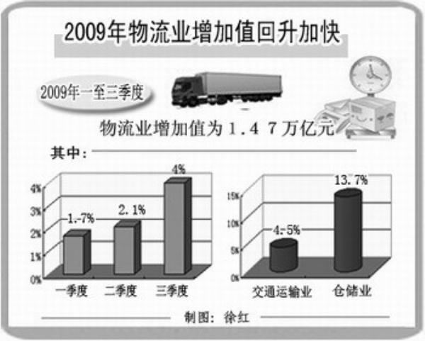 制造业与物流业加速融合,促进了物流业增加值加快回升。更多的制造企业与物流企业联手,从供应链角度整合上、下游企业的物流活动,形成相互渗透、联动发展的格局。数据显示,2009年前三季度,物流业增加值为1.47万亿元,同比增长4%,增幅比上半年提高1.9个百分点。