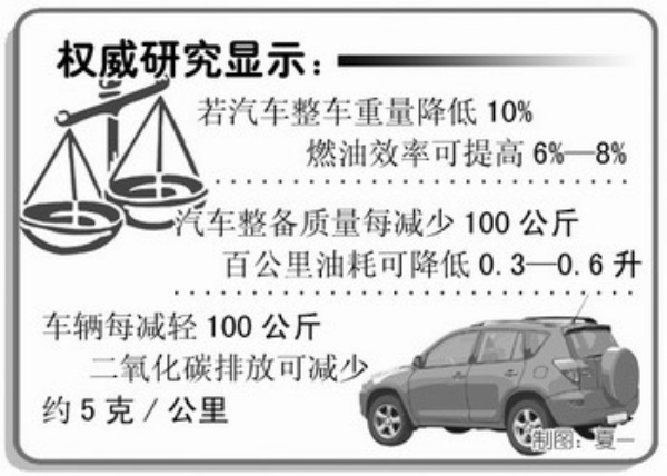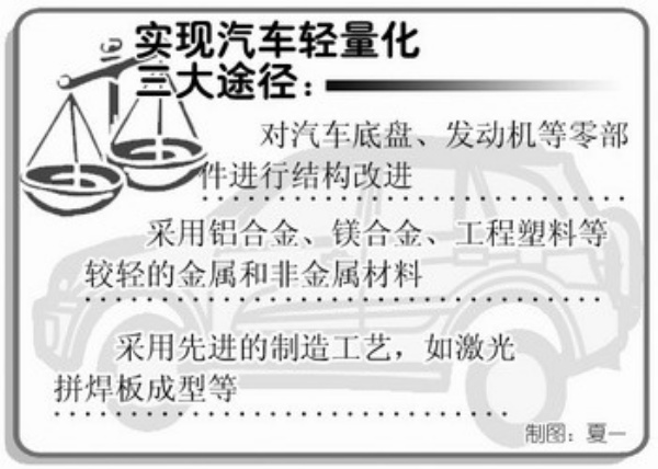 如何做到轻量化?专家介绍,实现汽车轻量化主要有三大途径:对汽车底盘、发动机等零部件进行结构改进;采用铝合金、镁合金、工程塑料等较轻的金属和非金属材料;采用先进的制造工艺,如激光拼焊板成型等。现在市场上看到的轻量化汽车产品,很大一部分开始使用高强度钢板、铝制车身来减轻车身重量。同时,全铝发动机的运用,与铸铁发动机相比,可以减轻一半的重量。未来,我们还能看到镁合金零件的广泛运用,奥迪的仪表板、克莱斯勒的变速器壳体及正时齿轮、奔驰的座椅架等都已采用这种材料。 正是因为轻量化有诸多好处,全球各国的主要汽车厂商都在力推轻量化工程。目前国外汽车自身重量同过去相比减轻了20%—26%。近年来,我国在汽车轻量化方面也取得了不少成果,一批汽车新材料项目被列为国家“863”、“973”高新技术项目和国家科技攻关重大项目,促进了汽车轻量化技术的进步。文/本报记者 童 娜