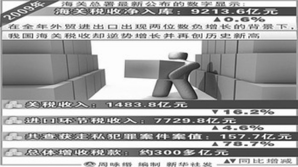 数据显示,面对严峻的税收形势,2009年海关税收净入库9213.6亿元,比2008年多收52.5亿元,增长0.6%,这已是海关税收连续20年创新高————