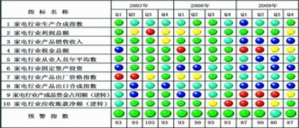 灯号:在构成中经家电产业预警指数的10个指标(仅剔除季节因素,保留随机因素)中,位于“蓝灯区”的有3个指标————出口合成指数、产品销售收入和固定资产投资。位于“浅蓝灯区”的有1个指标———从业人员。位于“绿灯区”的有3个指标———生产合成指数、工业品出厂价格指数和应收账款(逆转⑤)。位于“黄灯区”的有3个指标———利润总额、税金总额和家电行业产成品资金占用(逆转)。