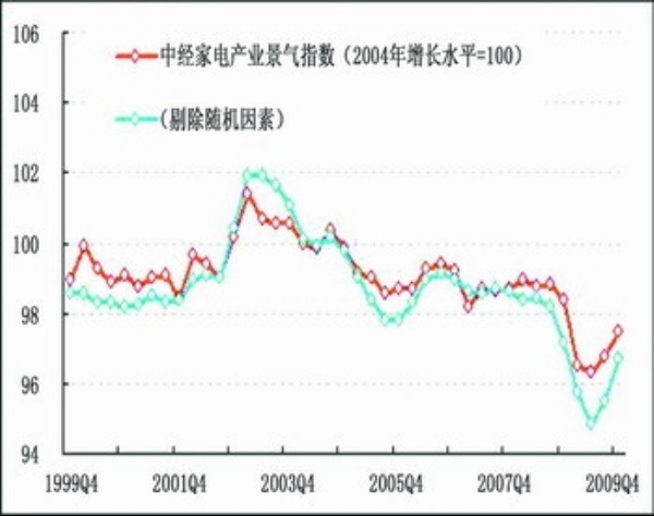 景气指数:2009年四季度,中经家电产业①景气指数为97.5点(2004年增长水平=100②),比上季度上升了0.8点,连续2个季度保持上升势头。
