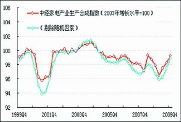 产量:2009年四季度,家电行业生产合成指数为99.2点(2003年增长水平=100),比上季度提升0.9点,连续3个季度保持回升势头。在进一步剔除随机因素后,四季度家电行业生产合成指数与上季度相比,亦保持回升趋势,回升幅度仍较保留随机因素的指数略弱(见图表中蓝色曲线),但差距较上季度进一步缩小,表明该行业生产中自身的增长动力强劲。
