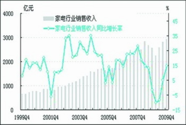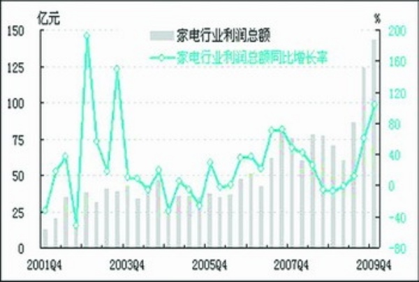 随着我国经济形势总体回升向好,家电产业回升速度不断加快。尤其是“家电下乡”、家电“以旧换新”、节能产品惠民工程等政策的积极效应日渐显现,内需对家电产业的强劲拉动,有效地缓解了国际金融危机带来的外需减弱等不利影响。家电企业运行状况良好,盈利大幅增加。2009年四季度,家电行业利润总额为143.6亿元,比上年同期增长104.0%;家电行业亏损企业亏损总额减少2.1亿元,同比下降125.5%。