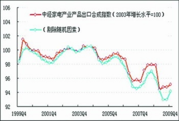 出口:2009年四季度,家电行业产品出口指数为95.1点,较上季度提升0.4点,呈现止跌回升,降幅收窄的迹象。