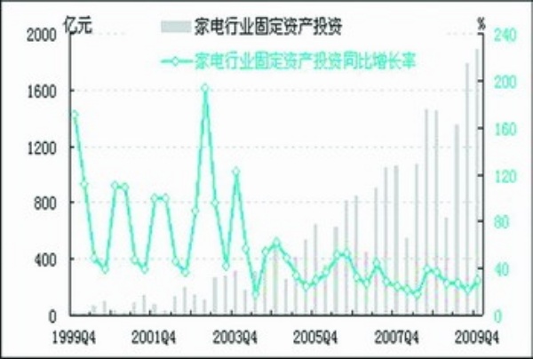投资:2009年四季度,经初步季节调整,家电行业固定资产投资总额为1883.5亿元,同比增长30.1%,较上季度提高8.2个百分点;环比增长5.4%,较上季度提高26.2个百分点。