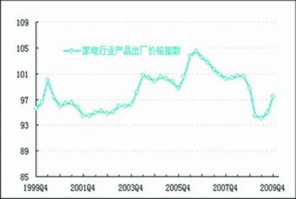 价格:2009年四季度,家电行业产品出厂价格指数为97.4点,与上季度相比上涨了2.4点。在构成家电行业产品出厂价格指数的2个指标中,电气机械及器材制造业工业品出厂价格指数为98.8点,比上季度提高4.5点;通信设备、计算机及其他电子设备制造业工业品出厂价格指数为96.0点,比上季度上升了0.3点。