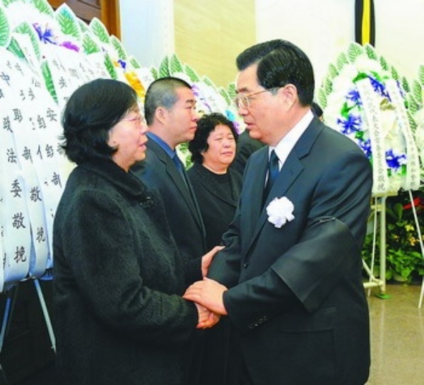接着,胡锦涛等围着烈士灵柩缓缓绕行一周,向8位烈士作最后的送别,然后走到8位烈士的亲属面前,同他们一一握手,向他们表示深切的慰问。