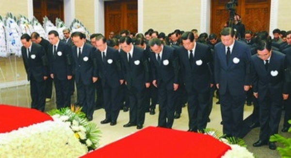 上午9时许,胡锦涛、吴邦国、温家宝、贾庆林、李长春、习近平、李克强、贺国强、周永康、刘淇、刘云山、李源潮、徐才厚、令计划、华建敏、马凯、孟建柱、戴秉国、廖晖、钱运录等胸佩白花,袖戴黑纱,在如泣如诉的哀乐声中慢步来到8位烈士的灵柩前,肃立默哀,向烈士灵柩三鞠躬。
